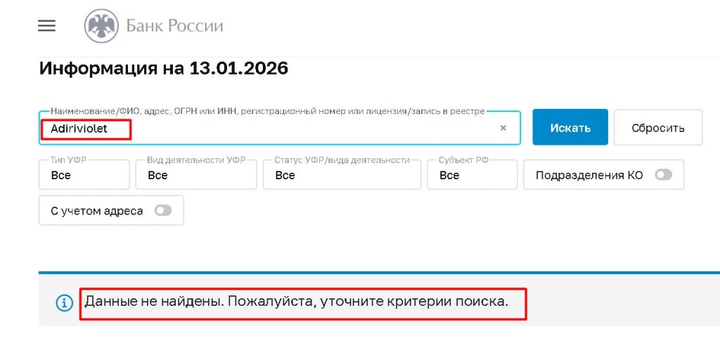 Заключение. Adiriviolet — классический пример фейкового брокера, созданного с единственной целью — хищения средств. Проект использует фиктивный европейский адрес, не имеет лицензий, а его сайты технически неработоспособны, что блокирует любую возможность проверки и диалога. Редакция настоятельно рекомендует избегать любых контактов с этой платформой. Помните: легальность брокера всегда можно и нужно проверить через официальные реестры государственных регуляторов.