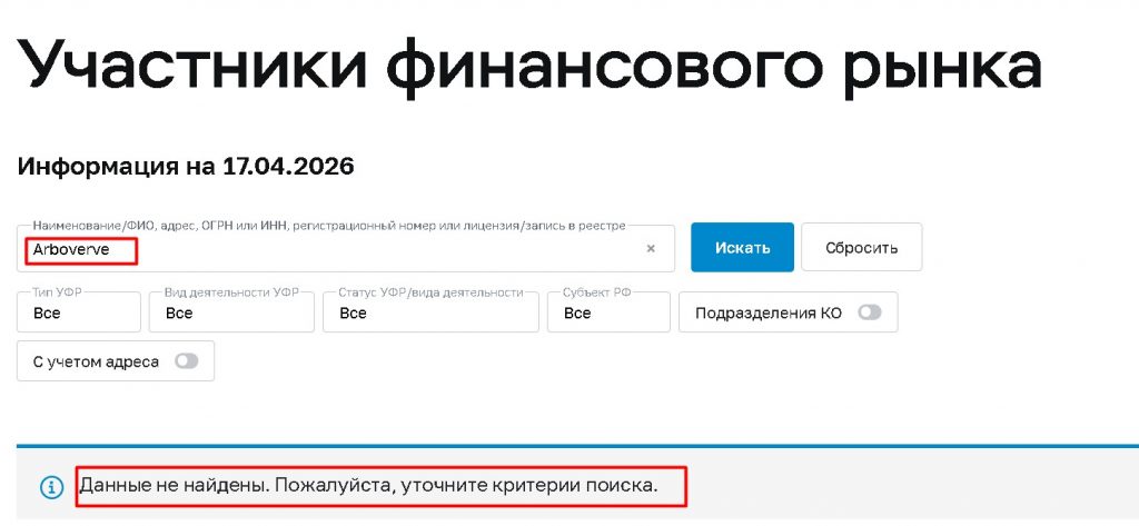 Но в ходе расследования выяснилось самое главное: 11 апреля 2026 года Центральный банк Российской Федерации официально внёс Arboverve (arboverve.com) в список компаний с признаками нелегального профессионального участника рынка ценных бумаг . Это прямое указание регулятора: компания не имеет права работать на финансовом рынке России.