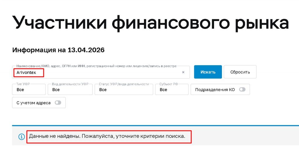 При проверке названия Arivontex, arivontex.com, arivon-tex.pro, arv-tex.link или любых других реквизитов в реестре ЦБ РФ не будет найдено никакой информации. У этой «платформы» нет и никогда не было лицензии на осуществление брокерской деятельности в России.