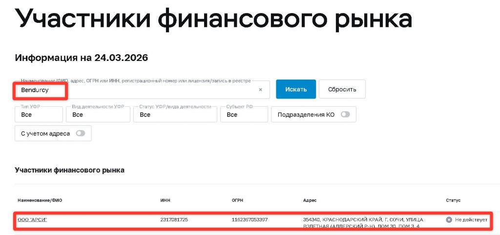 При проверке названия Bendurcy, bendurcy.com, bend-urcy.pro или любых других реквизитов в реестре ЦБ РФ не будет найдено никакой информации. У этой «платформы» нет и никогда не было лицензии на осуществление брокерской деятельности в России.