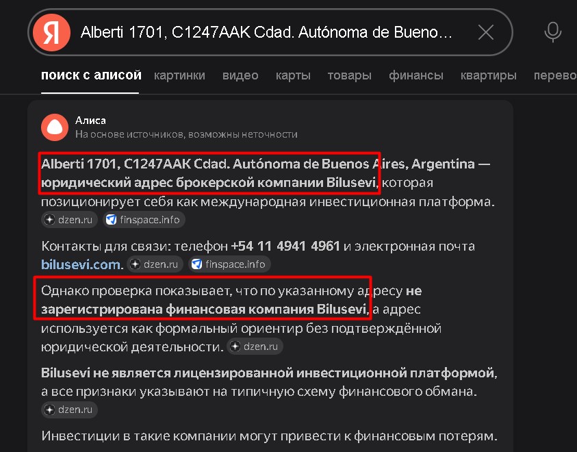 Проект Bilusevi позиционирует себя как солидного международного брокера, якобы работающего с 2017 года. На своих сайтах bilusevi.com, bilu-sevi.biz и bl-sevi.top он обещает доступ к торговле широким спектром активов — от валют и акций до криптовалют — через удобный личный кабинет. Всё это работает под обещанием регулирования сразу несколькими авторитетными органами: CySEC, ASIC, DFSA и FCA. Для создания видимости легальности указаны юридический адрес в Буэнос-Айресе, Аргентина (Alberti 1701, C1247AAK), телефон +54 11 4941 4961 и почта support@bilusevi.com.