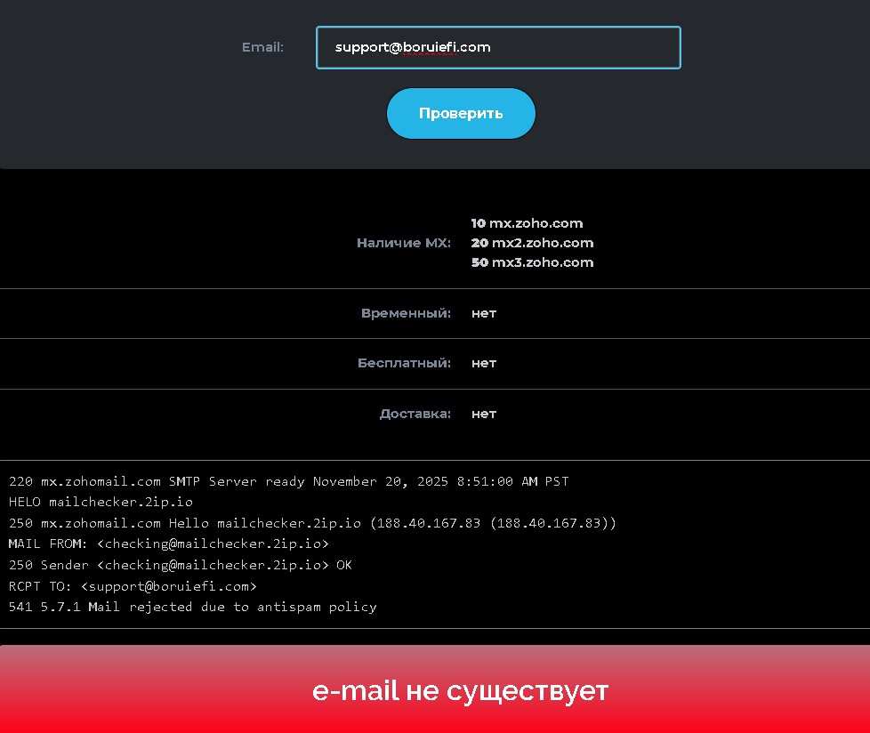 домены boruiefi.com и borui-efi.co зарегистрированы через анонимного провайдера. Электронная почта support@boruiefi.com используется для автоматических ответов с шаблонными отписками.