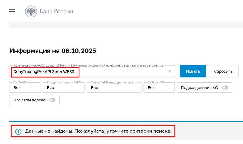 Параметр | CopyTradingPro / Zorin WEB3 | Надёжная брокерская / торговая платформа |
