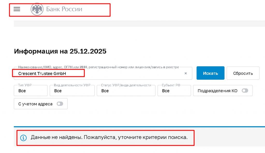 | Регулирование в Швейцарии (FINMA) | Подразумевается статус лицензированного финансового института или траста. | Критически важная проверка провалена. В реестре Швейцарского органа надзора за финансовыми рынками (FINMA) нет компании «Crescent Trustee GmbH». Любая деятельность по управлению чужими активами в Швейцарии подлежит лицензированию FINMA. Отсутствие в реестре — прямое доказательство незаконности. |