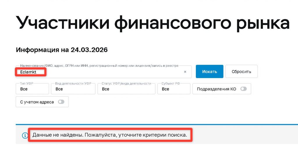 При проверке названия Eclemkt, eclemkt.net, eclem-kt.com или любых других реквизитов в реестре ЦБ РФ не будет найдено никакой информации. У этой «платформы» нет и никогда не было лицензии на осуществление брокерской деятельности в России.