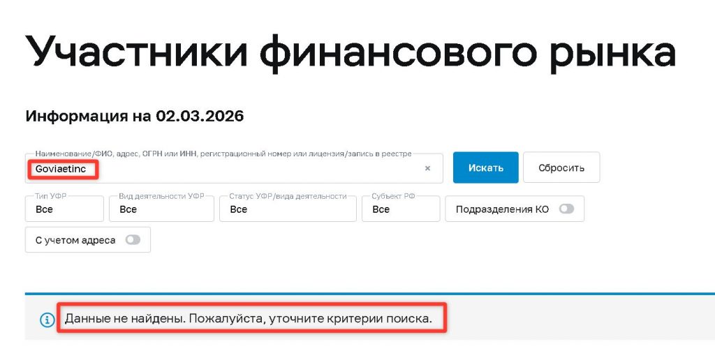 О компании Goviaetinc нет абсолютно никакой информации в открытых источниках. Ни на специализированных форумах, ни в реестрах регуляторов, ни в новостных лентах — ничего.