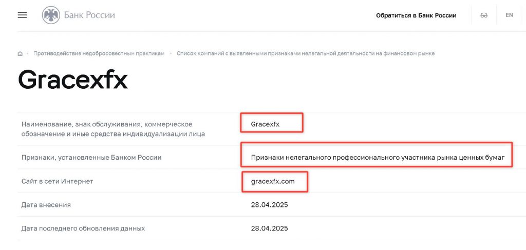 28 апреля 2025 года Центральный банк Российской Федерации внес Gracexfx в свой «Список компаний с выявленными признаками нелегальной деятельности на финансовом рынке» .