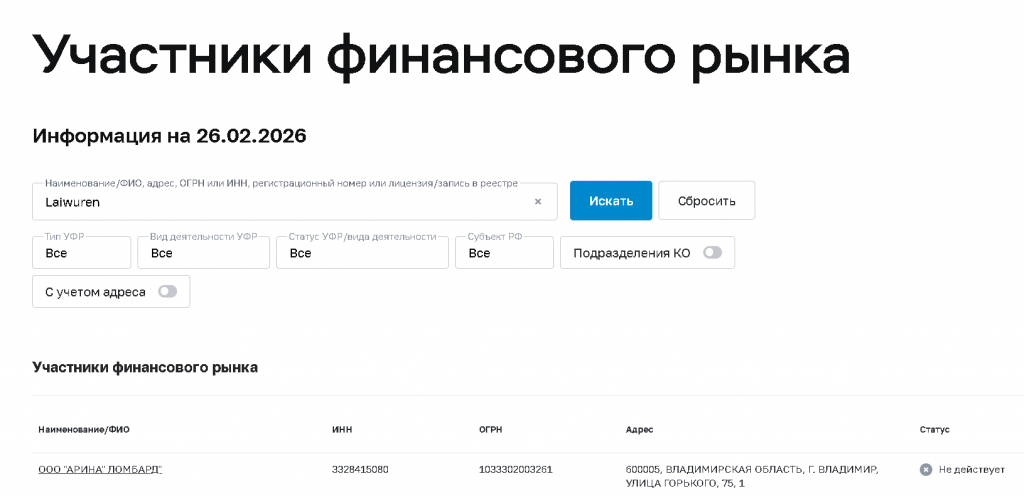 О компании Laiwuren нет абсолютно никакой информации в открытых источниках. Ни на специализированных форумах, ни в реестрах регуляторов, ни в новостных лентах, ни в базах данных юридических лиц — везде пустота.
