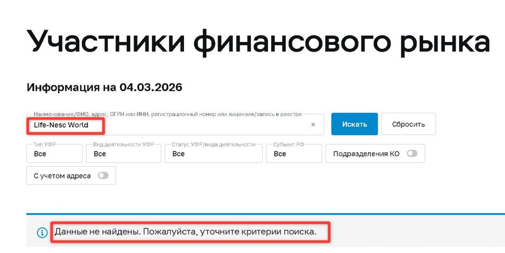 Сайт life-nesc.world, по данным открытых источников, был запущен относительно недавно. Это первый тревожный звоночек: настоящие брокеры с историей работают годами, а такие проекты живут от силы несколько месяцев, после чего закрываются и открываются под новым названием. Упоминается, что сайт мог появиться в январе 2026 года . То есть на момент написания статьи ему всего пара месяцев.