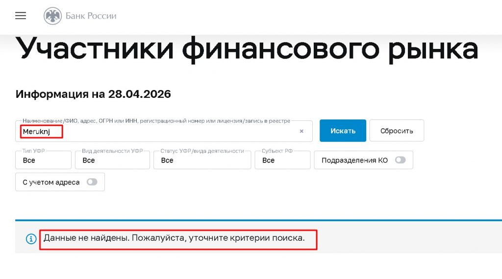 При проверке названия Meruknj, meruknj.com или meru-knj.site в реестре ЦБ РФ не будет найдено никакой информации. Согласно разъяснениям самого регулятора, «если в справочнике по введенным реквизитам вы не смогли проверить информацию о наличии у организации лицензии, аккредитации или сведений о ее включении в реестр, то высока вероятность, что компания ведет свою деятельность без необходимого разрешения Банка России. Сотрудничество с нею может повлечь за собой нарушение ваших прав» .