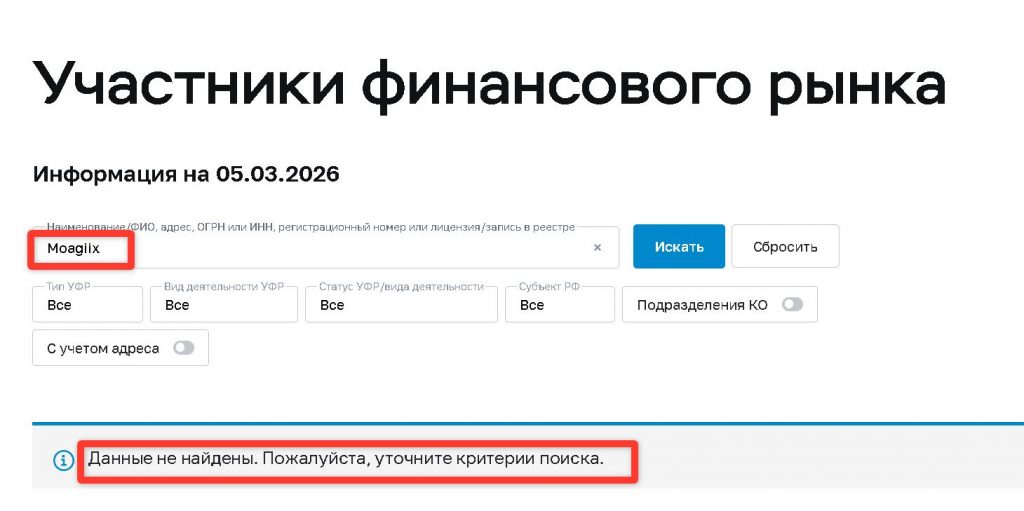 О компании Moagiix нет абсолютно никакой информации в открытых источниках. Ни на специализированных форумах, ни в реестрах регуляторов, ни в новостных лентах — ничего.