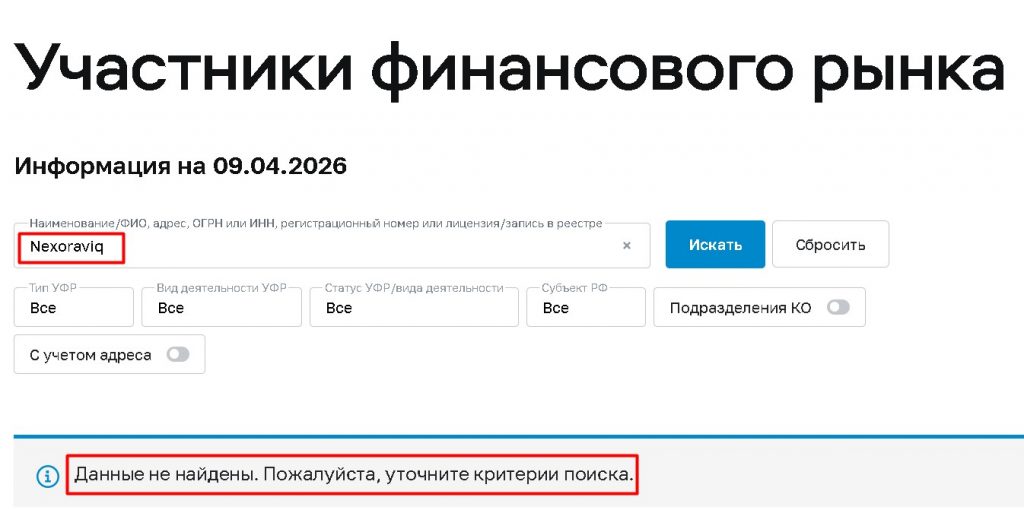 При проверке названия Nexoraviq, nexoraviq.pro или любых других реквизитов в реестре ЦБ РФ не будет найдено никакой информации. У этой «платформы» нет и никогда не было лицензии на осуществление брокерской деятельности в России.