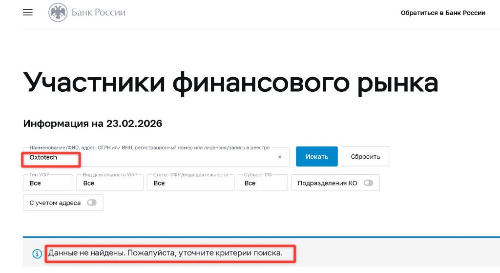 О самом проекте Oxtotech с сайтами oxto-tech.pro и oxtotech.com нет практически никакой информации в открытых источниках. Ни на специализированных форумах, ни в реестрах регуляторов, ни в новостных лентах — везде пустота.