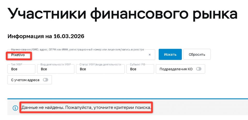 Естественно, при проверке названия Pixetivo, адреса в Буэнос-Айресе или любых других реквизитов в реестре ЦБ РФ не будет найдено никакой информации. У компании нет и никогда не было лицензии на осуществление брокерской деятельности в России.