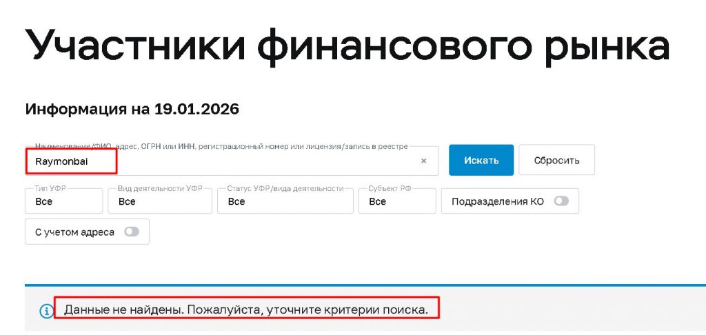 | Лицензии регуляторов | Возможно, на сайте есть логотипы FCA, CySEC или других регуляторов. | Лицензии отсутствуют. Проверка в реестрах ЦБ РФ, FCA, CySEC, ASIC не находит компанию «Raymonbai». Любые заявления о регулировании — ложь. |