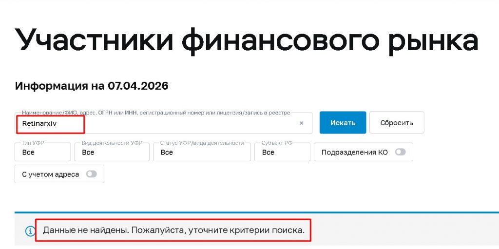 Есть ли у мошеннического Retinarxiv лицензия ЦБ РФ?