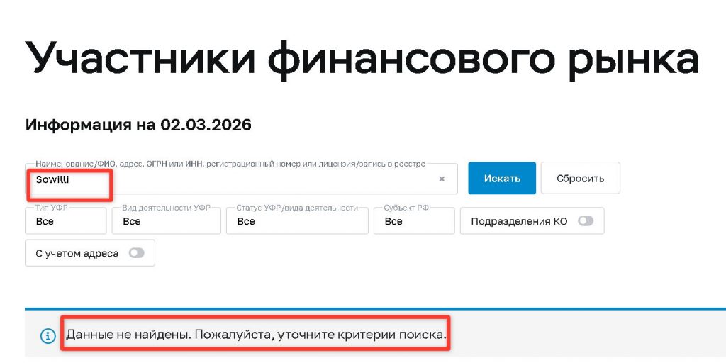 О компании Sowilli нет абсолютно никакой информации в открытых источниках. Ни на специализированных форумах, ни в реестрах регуляторов, ни в новостных лентах — ничего.