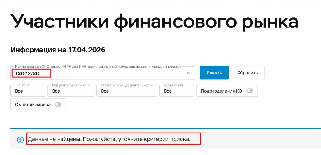 При проверке названия Tasenovass, tasenovass.com или любых других реквизитов в реестре ЦБ РФ не будет найдено никакой информации. У этой «платформы» нет и никогда не было лицензии на осуществление брокерской деятельности в России.