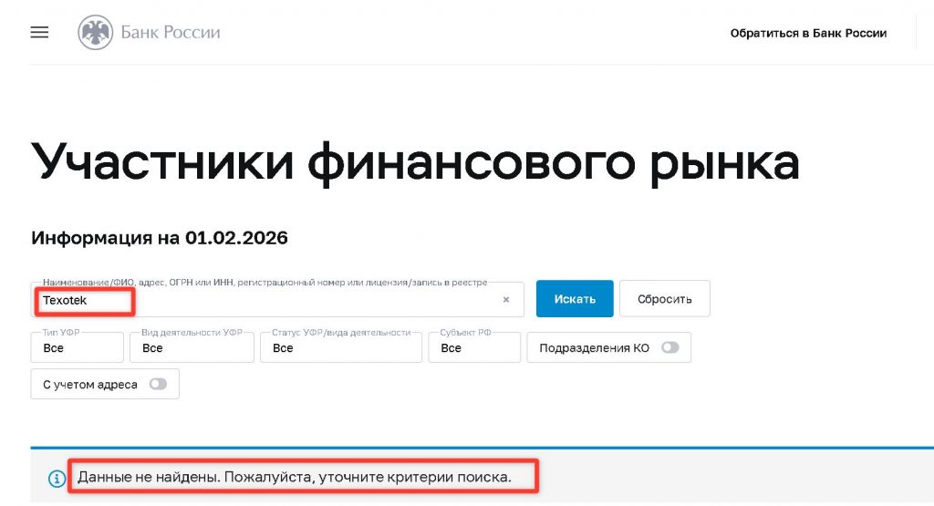 | Международные лицензии (FCA, CySEC, ASIC) | На сайте есть общие фразы, но нет конкретных номеров лицензий. | Регуляция не подтверждена. Texotek не представлена в реестрах ведущих мировых надзорных органов. |