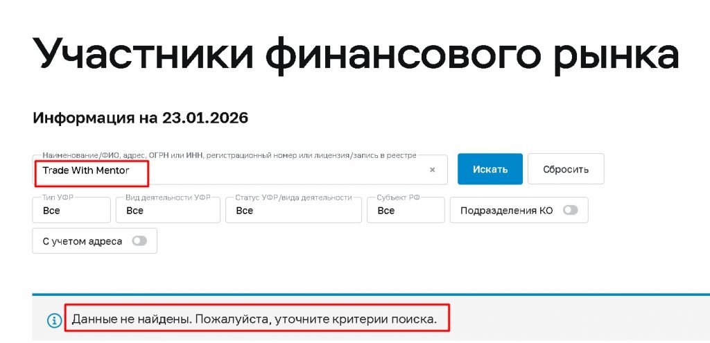 Компания Trade With Mentor (TradeWithMentors.com) не является ни образовательным проектом, ни брокером. 20 ноября 2025 года авторитетная международная организация Financial Commission опубликовала официальное заявление «Scam ALERT», включив TradeWithMentors в свой Warning List (Список предупреждений).