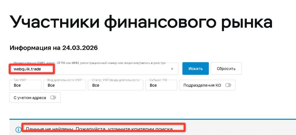 При проверке названия webquik.trade, «Web Quik» или любых других реквизитов в реестре ЦБ РФ не будет найдено никакой информации. У этого «брокера» нет и никогда не было лицензии на осуществление брокерской деятельности в России.