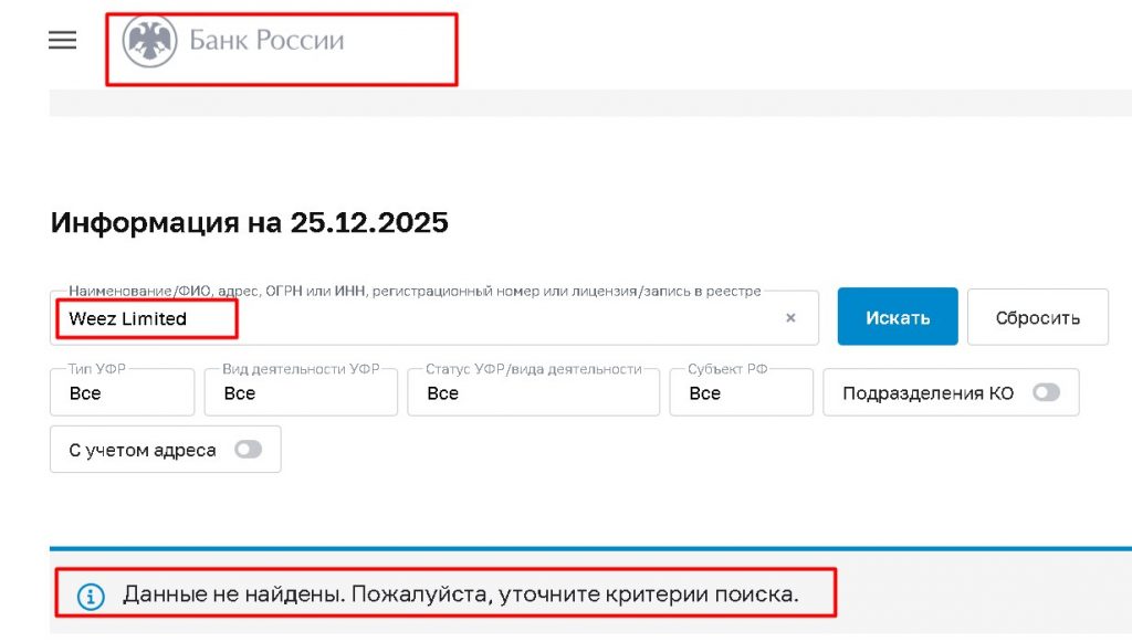| Регулирование в США (FINRA/SEC) | Подразумевается статус легального финансового оператора. | Критически важная проверка провалена. Чтобы работать с клиентами как брокер-дилер или инвестиционный советник в США, компания обязана быть зарегистрированной в Комиссии по ценным бумагам и биржам (SEC) и иметь членство в Регулирующем органе финансовой индустрии (FINRA). В реестрах SEC/FINRA нет компании с названием «Weez Limited». Её регистрация в штате Коннектикут (если она есть) не даёт права на финансовую деятельность. |