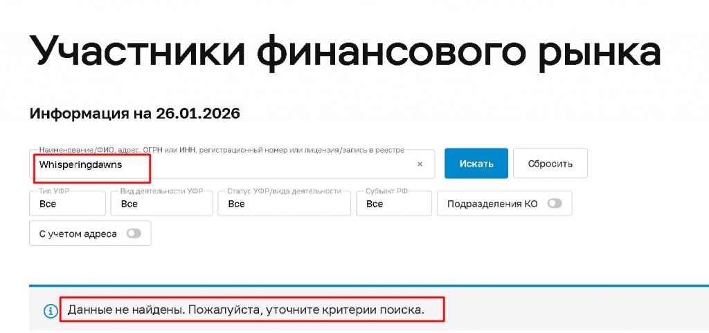 - Самостоятельно проверьте лицензию. Не верьте скриншотам на сайте. Найдите официальный сайт регулятора (FCA, CySEC, ЦБ РФ) и через поиск в его реестре убедитесь, что компания там действительно зарегистрирована. Для Whisperingdawns такой проверки достаточно, чтобы увидеть обман.